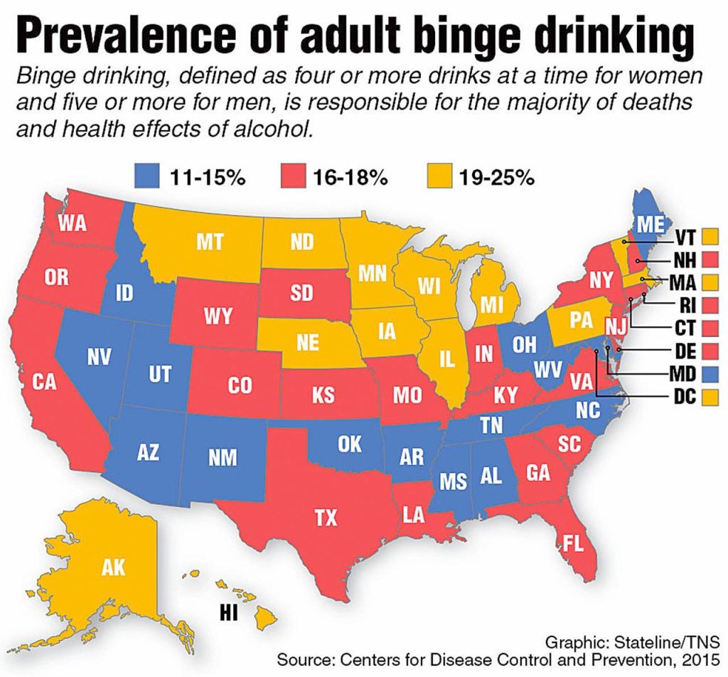 This map shows the prevalence of binge drinking. (Stateline/2016)