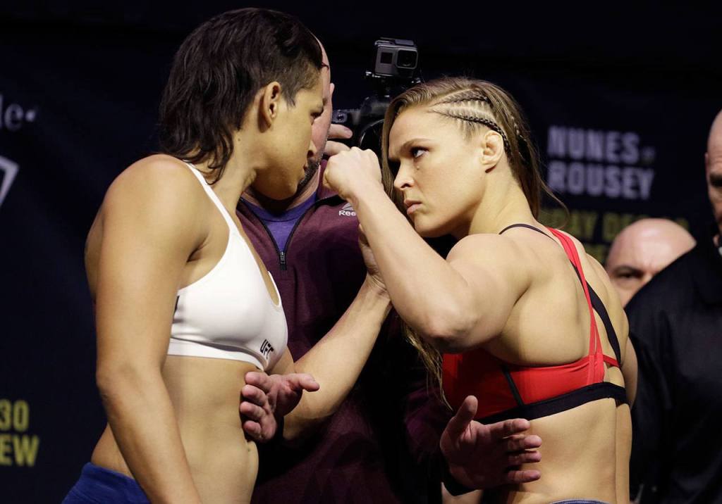 LAS VEGAS — Ronda Rousey climbed on the scale and glared into the distance while the crowd roared. Moments later, she directed that withering gaze at UFC bantamweight champion Amanda Nunes, who stared right back.