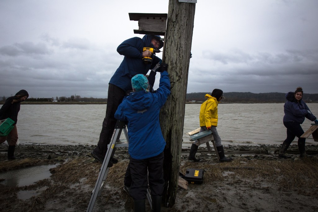 Ray Oliver, a volunteer for the Nature Conservancy, drills a bird box into a post at Port Susan Bay during a meet-up to restore bird boxes and gourds to the area on Feb. 13, 2016. The bird boxes will eventually house tree swallows and the gourds will bring in purple martins.