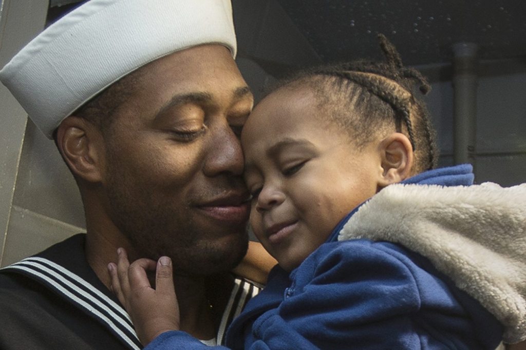 As his fellow crew heads to the mess hall to meet their families, Seaman Sean Tender and daughter Sydney, 2, hold each other after the USS Kidd docks at Everett Naval Station on Monday, Nov. 21, 2016 in Everett. (Andy Bronson / The Herald)