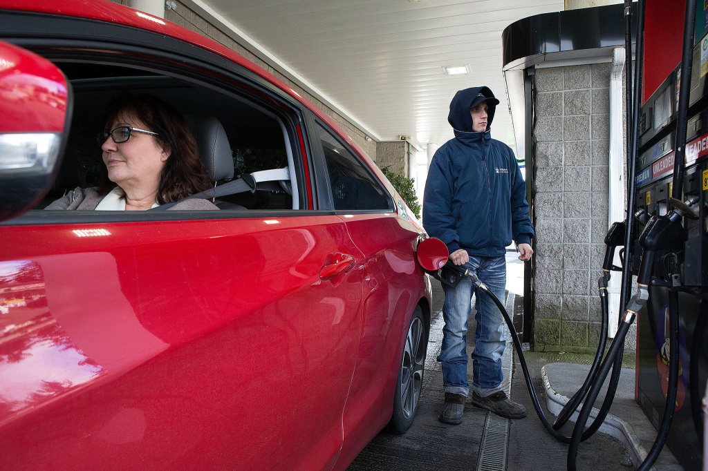 General Car Wash employee Anton Suyurov pumps gas for Becky Zuckerberg, who lives in Snoqualmie and works in Everett. She likes the full service she gets at the gas station, especially on cold days. (Andy Bronson / The Herald)