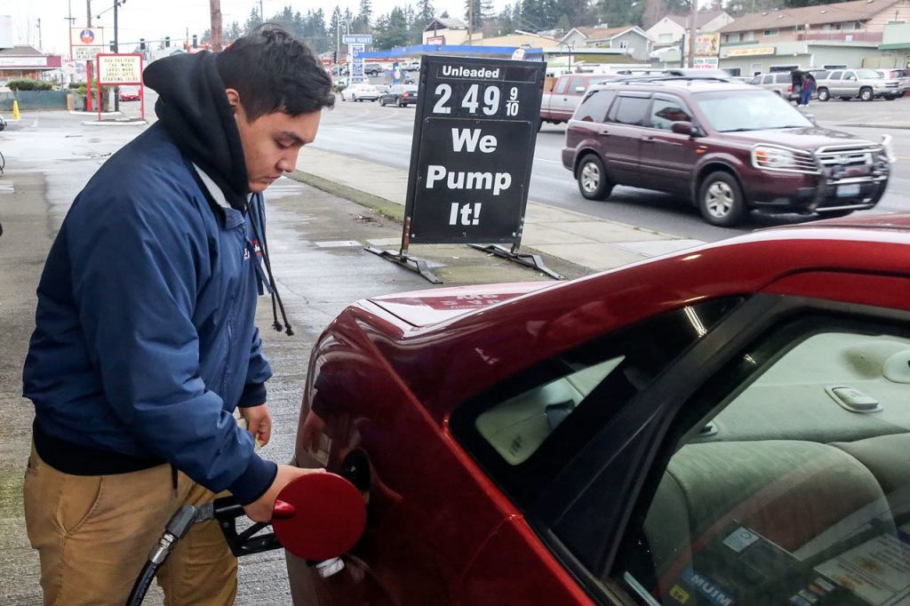 Andrew Caindoy pumps gas at General Brushless Car Wash, a full-service gas station and car wash in Everett. (Kevin Clark / The Herald)