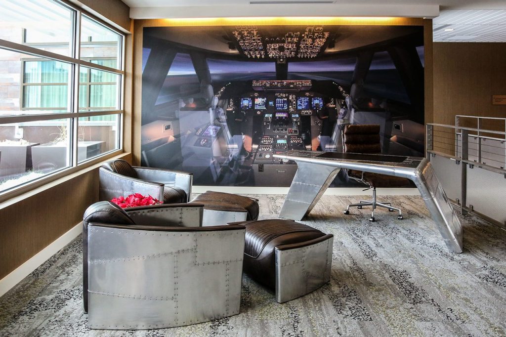 “This has been a kind of Facebook favorite,” Myers said of the aeronautical-themed furnishings in the public area of the hotel’s second floor.