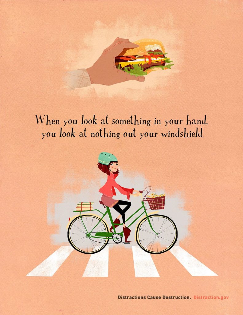 Can’t the burger wait? This poster from Distraction.gov, the U.S. Government website for Distracted Driving awareness and information, cautions against multitasking (including devouring a delicious burger) while driving. (distraction.gov image)