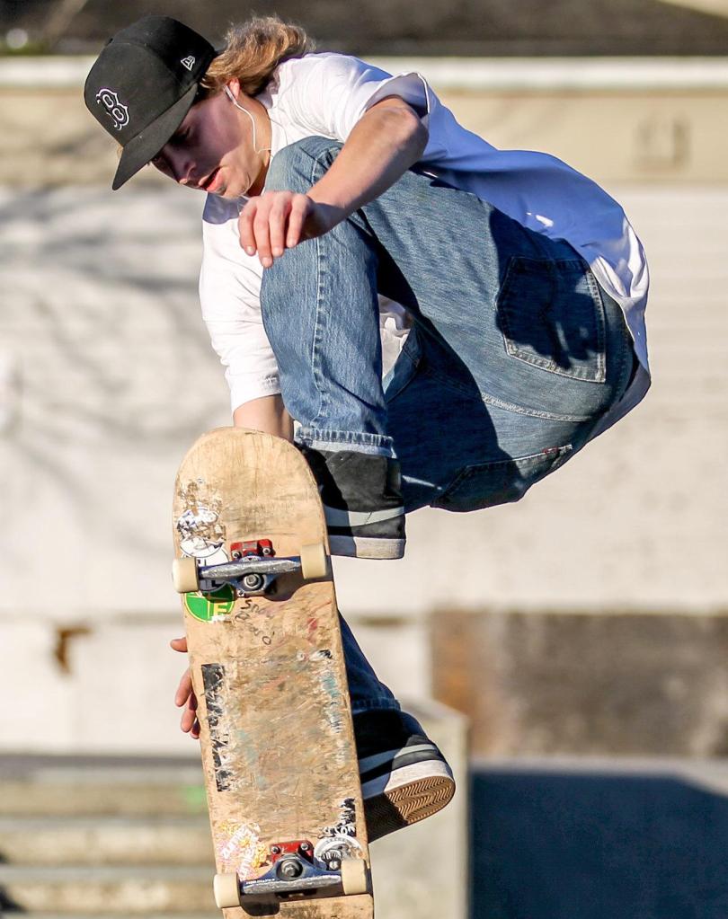 Alex Pride, 22, works out Thursday afternoon at Snohomish Skate Park. (Kevin Clark / The Herald)
