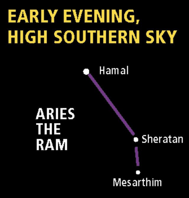 Currently, Aries the Ram resides in the early evening, high southern sky, almost overhead. There’s not that much to it, just two medium bright stars and a dimmer one that arguably outlines the horn of a ram. You can’t miss it because it’s very distinct.