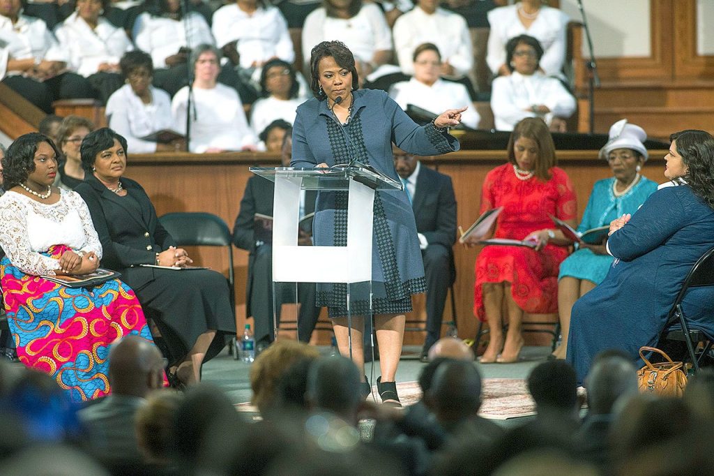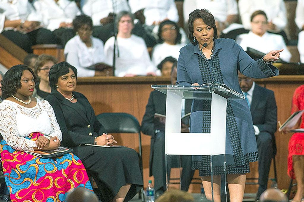 Bernice King, daughter of the late Rev. Martin Luther King Jr., speaks during the King holiday commemorative service at Ebenezer Baptist Church, where King preached, in Atlanta on Monday. (AP Photo/Branden Camp)