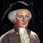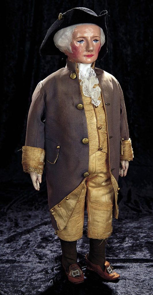 A President Washington doll made after 1880 looks like Washington in his presidential years. The doll is made of cloth with pressed and oil-painted features, and gray hair worn in a ponytail. His eyes are blue. The doll is dressed in a silk suit with a lace jabot and wears a tri-corn hat, black stockings and shoes with buckles. The costume is a familiar one. The doll probably was not made for a young child, but as a part of the 1889 centennial celebration of Washington’s inauguration. It was made by Martha Jenks Chase who started making portrait dolls in her backyard about 1880. A 25-inch tall Chase Washington doll sold at a May 14, 2016, Theriault’s auction in Las Vegas for $3,080.
