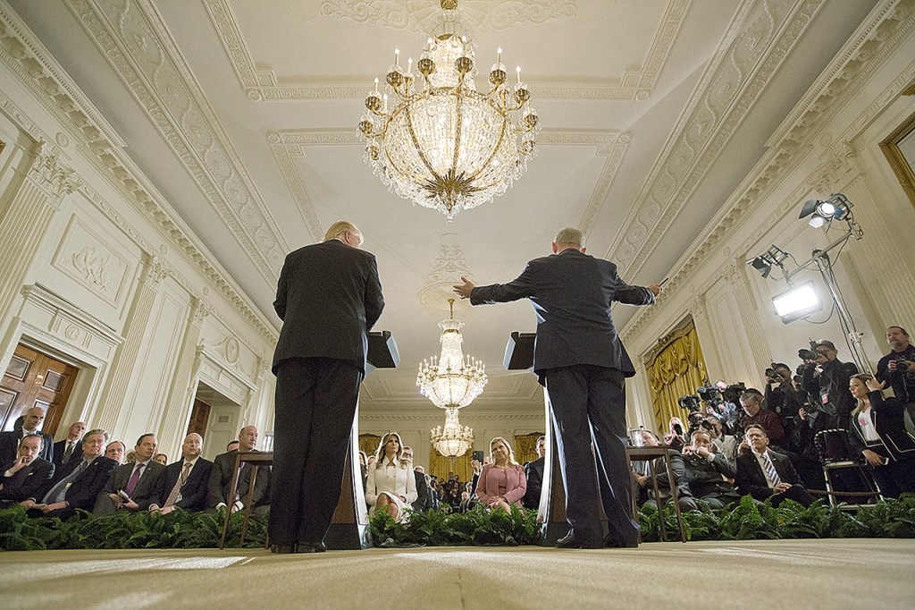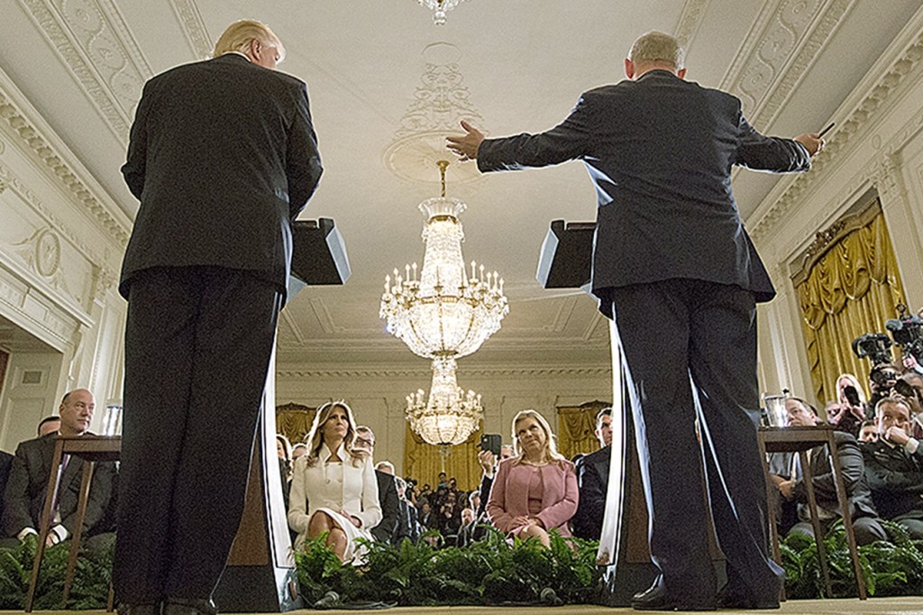 President Donald Trump and Israeli Prime Minister Benjamin Netanyahu participate in a joint news conference in the East Room of the White House in Washington on Wednesday, Feb. 15. (AP Photo/Pablo Martinez Monsivais)