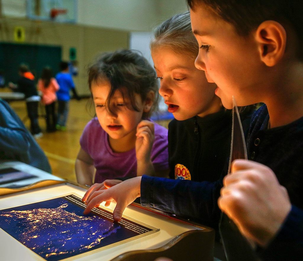 For kindergarten through second grade, the morning kicked off with an assembly. A couple hundred students sat on the floor for an introduction to astronomy. They struggled to keep quiet as Janice Crew, Kate Wellens and Mike Sweeney from the Pacific Science Center launched into their “Space Odyssey.”