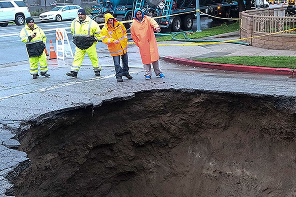 Inspectors examine a sinkhole Saturday in Studio City, north of Los Angeles. Two vehicles fell into the 20-foot sinkhole on Friday night. (AP Photo/Ringo Chiu)