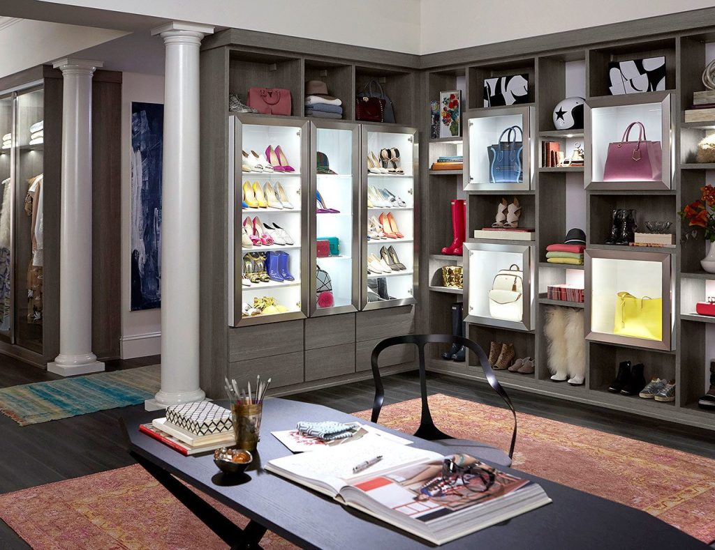 Ward’s design studio has replaced ordinary panels, wire shelving and baskets with rich, textured wood grain melamine accented with pearl-inlay cabinet hardware and lighted drawers.