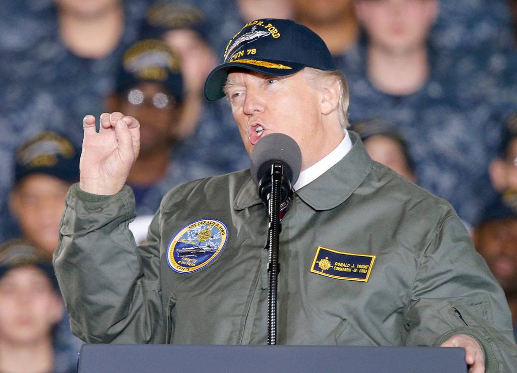 Trump spoke from the Gerald R. Ford, a $12.9 billion warship that is expected to be commissioned this year after cost overruns and delays. He touted his spending plans, saying he would provide “the finest equipment in the world” and give the military the “tools you need to prevent war.”