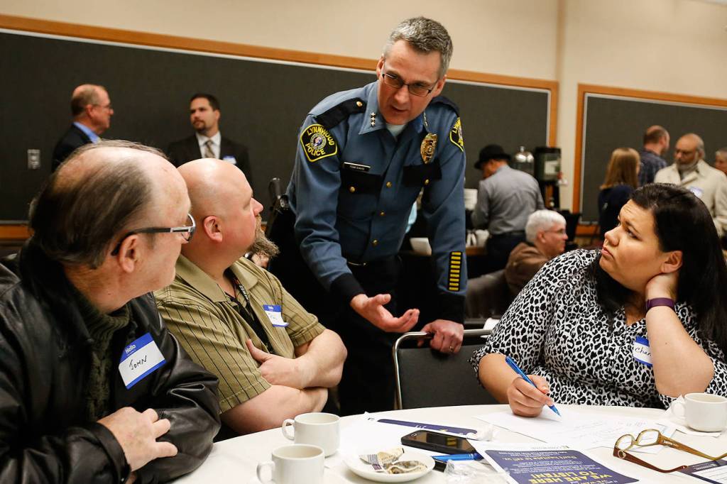 Police Chief Tom Davis and his command staff met last month with about 50 people from a spectrum of religions, officially launching the “Cops and Clergy” program. Officers had to carry additional chairs into a conference room at the Lynnwood Convention Center to accommodate the crowd.