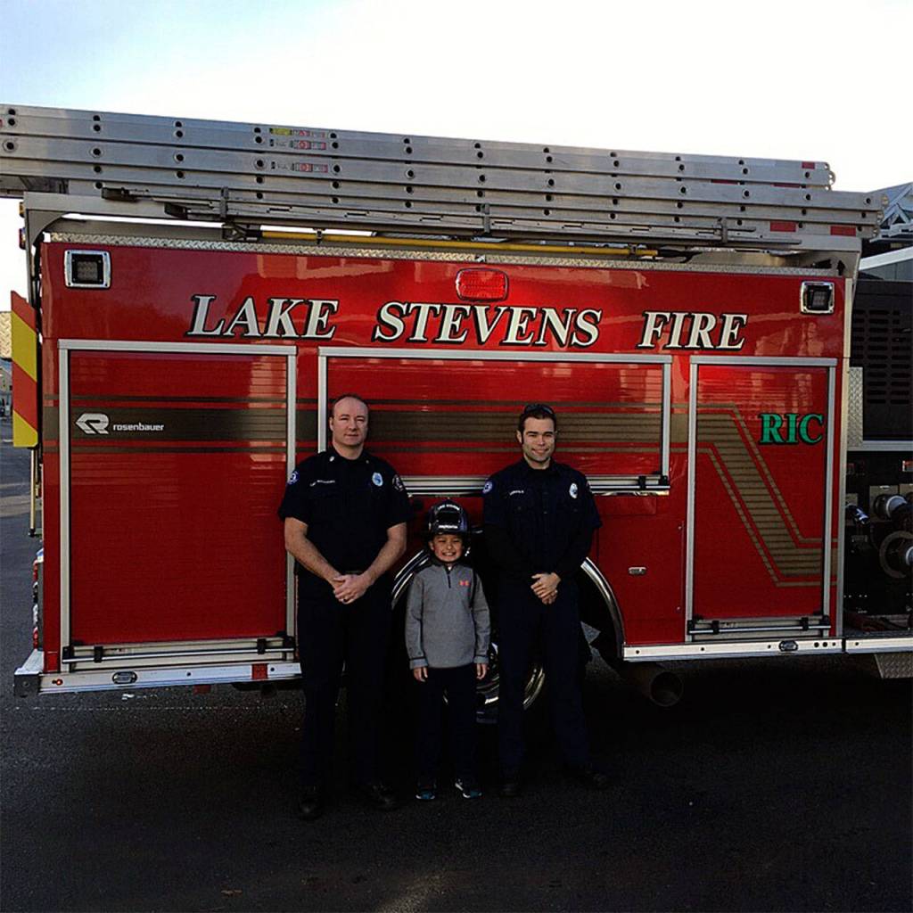 Owen Hanuse and family made the winning bid in the local silent auction fundraiser. Owen received a ride to school on a fire engine and the right to use the Lake Stevens firefighter’s Vikings Super Fan fire helmet for the spring sports season.