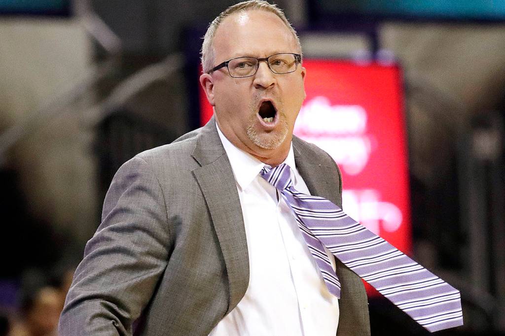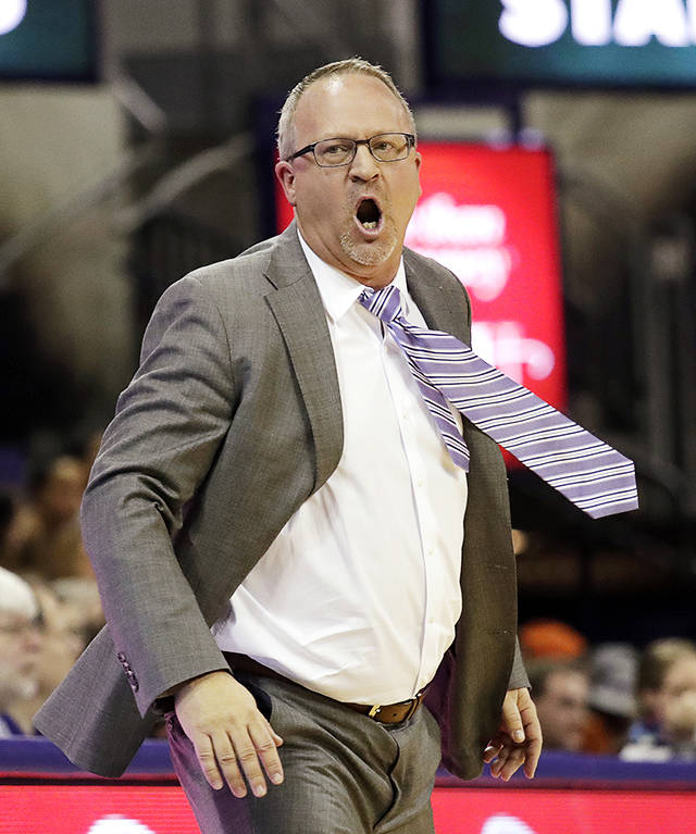 Washington head coach Mike Neighbors reacts to a call against his team in the second half of an NCAA college basketball game against Southern California on Jan. 6 in Seattle. (AP Photo/Elaine Thompson)