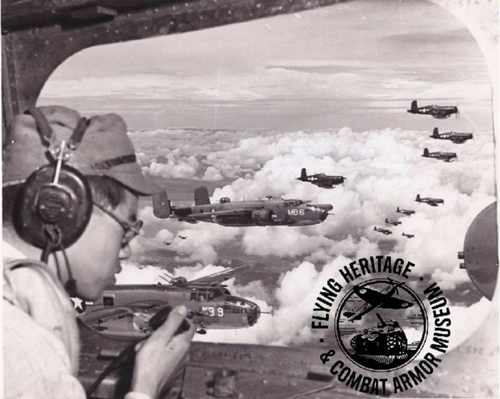 The aircraft was built at Goodyear in Akron, Ohio in April 1945. It was assigned to Marine Squadron VMF-115 in the southern Philippines and flew in combat in July and August 1945. The Marines were based at Zamboanga and flew close air support and combat air patrols during these months. This photo shows VMF-115 Corsair escorting Marine PBJs on a bombing mission.