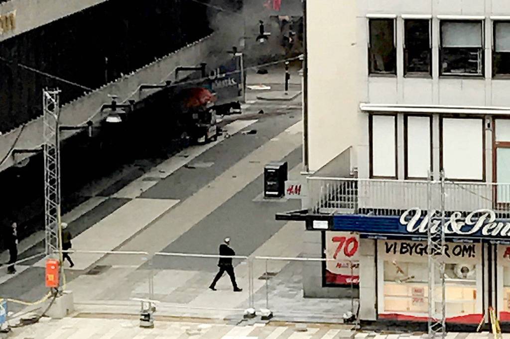 STOCKHOLM — A hijacked beer truck plowed into pedestrians at a central Stockholm department store Friday, killing four people, injuring 15 and sending screaming shoppers scattering in panic in what Sweden’s prime minister called a terrorist attack.