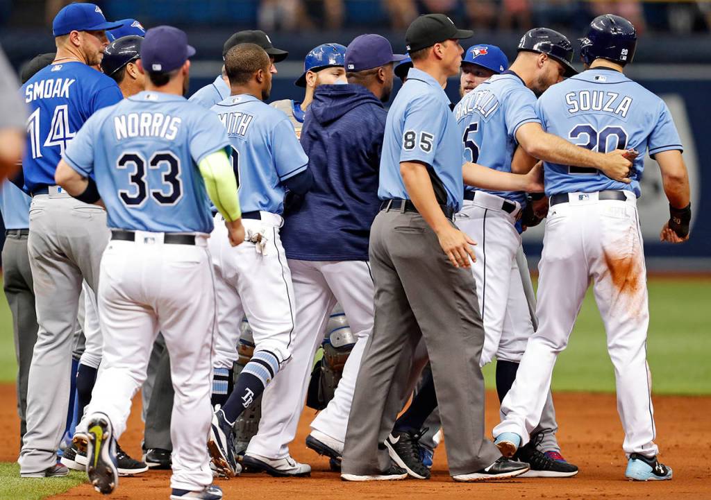 Both benches briefly emptied in the second when Toronto shortstop Troy Tulowitzki took issue with Souza’s slide into second base on Logan Morrison’s double-play grounder. No punches were thrown.