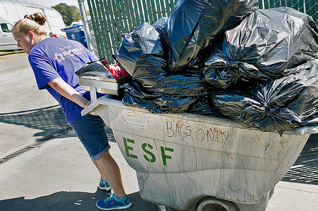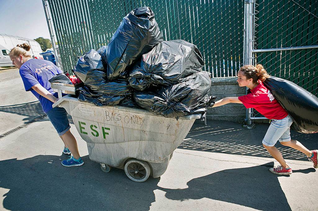 Madison Berry (left) and Zoie Miller hauled bags of garbage during the 2014 Evergreen State Fair. (Kevin Clark/ Herald file)