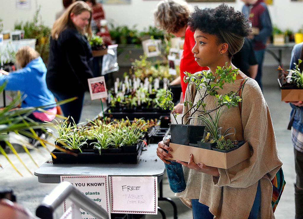 A good number of plant lovers turned out at Everett Community College’s annual plant swap, an Earth Day event at Whitehorse Hall, on April 18. (Dan Bates / The Herald)