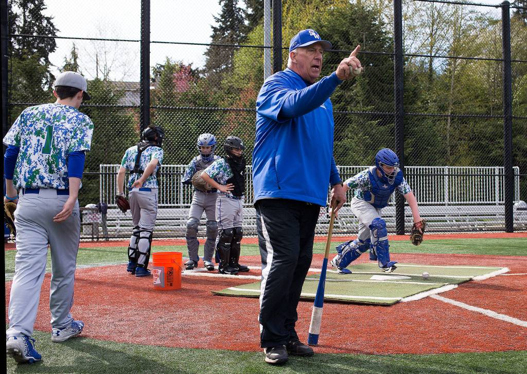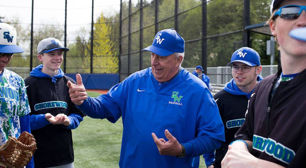 Shorewood head baseball coach Wyatt Tonkin jokes with his players on Monday, April 24, 2017 in Shoreline, Wa. Tonkin reached his 300th win last week. (Andy Bronson / The Herald)