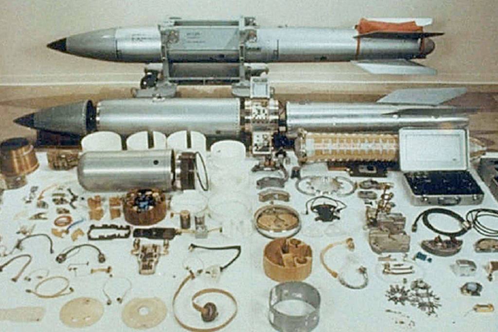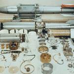 B61 bombs in various stages of assembly. The nuclear warhead is contained in the small, silver cylinder near the upper middle. (Wikipedia)