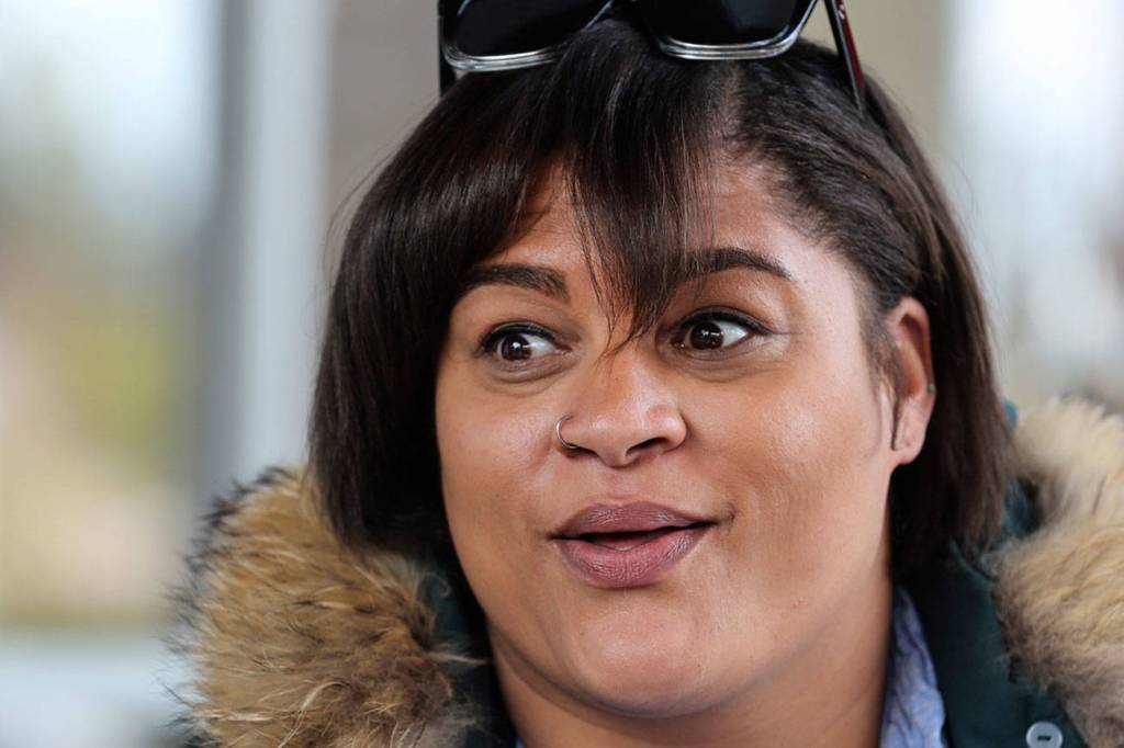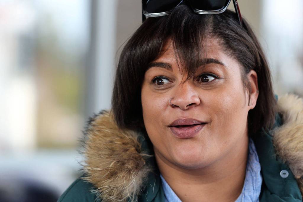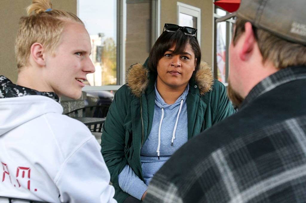 Whitney Hooks, center, listens to the Robert Griffith, right, father of potential client, Rylee Griffith, in Everett on March 31. The four-time state champion shot put thrower from Cascade High School has returned to the area to train and mentor young people. (Kevin Clark / The Herald)
