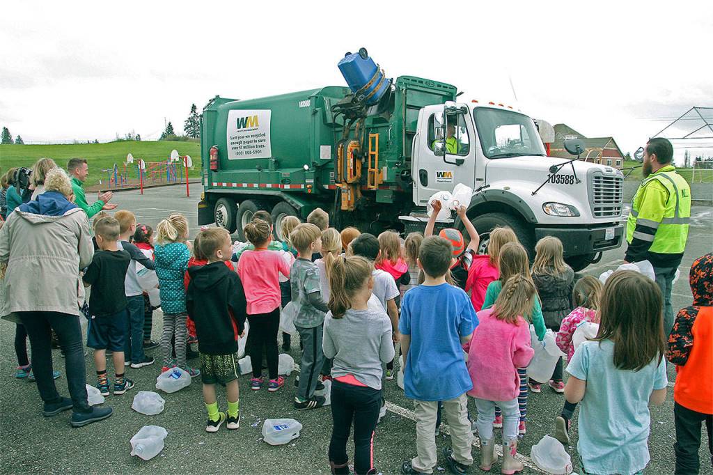 Waste Management visited the school in honor of Earth Day. Students brought out milk jugs they had collected over a few weeks — crafting a large igloo in the meantime — to see what happens to the jugs when they leave the big green bins for recycling. Students also got a chance to climb in the driver’s seat of the recycling truck.