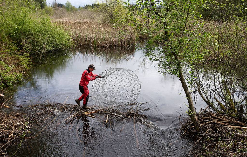 Mike Rustay, with Beavers Northwest, rolls a protective cage across a beaver dam as he begins installing a flexible pond leveler at the site on Friday, May 5, 2017 in Mill Creek. The beaver dams have caused water to back up in Penny Creek and spill across and flood 35th Street nearby. (Andy Bronson / The Herald)