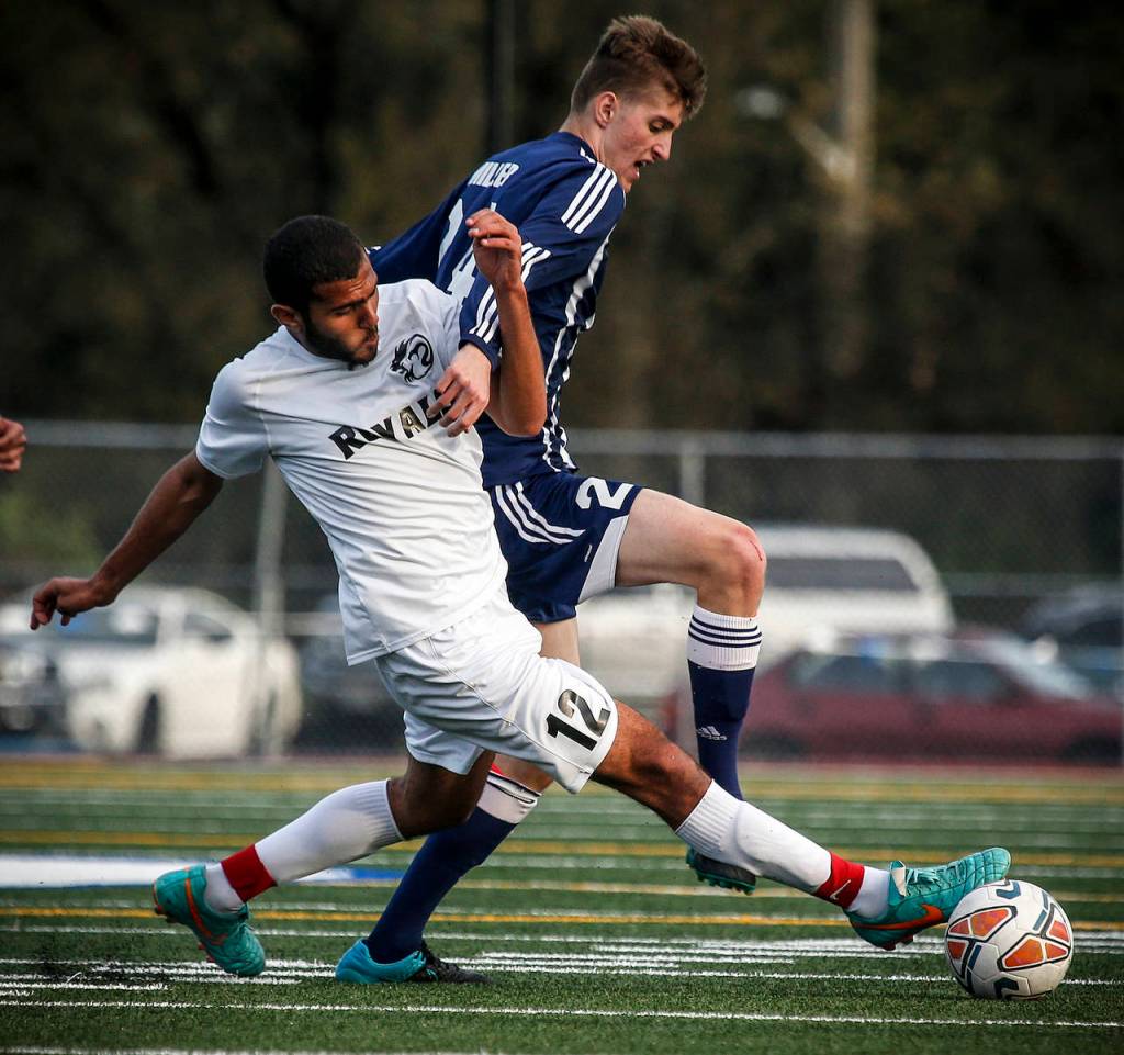 Lynnwood’s Rofaiel Dawood steals the ball from Squalicum’s Connor Miller during a 3A District 1 Tournament semifinal game on May 9, 2017, at Shoreline Stadium. Lynnwood beat Squalicum 2-1. (Ian Terry / The Herald)