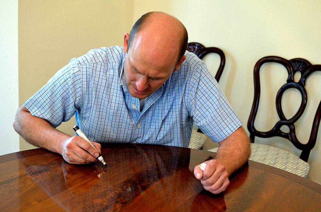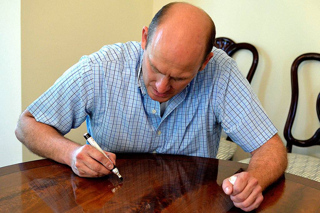 Keith Fritz, whose firm, Keith Fritz Fine Furniture, is based in Indiana, has been making custom dining tables with hand-rubbed finishes for more than 20 years. Fritz, whose work is sold through designers, cautions his clients about four things that can damage wood finishes: temperatures above 120 degrees, abrasions, standing or trapped water and harsh chemicals.