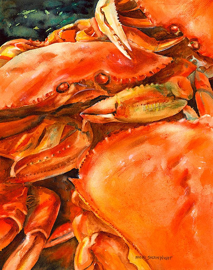 A member of the Northwest Watercolor Society, she enjoys talking about her technique and the way in which watercolorists paint backward.
