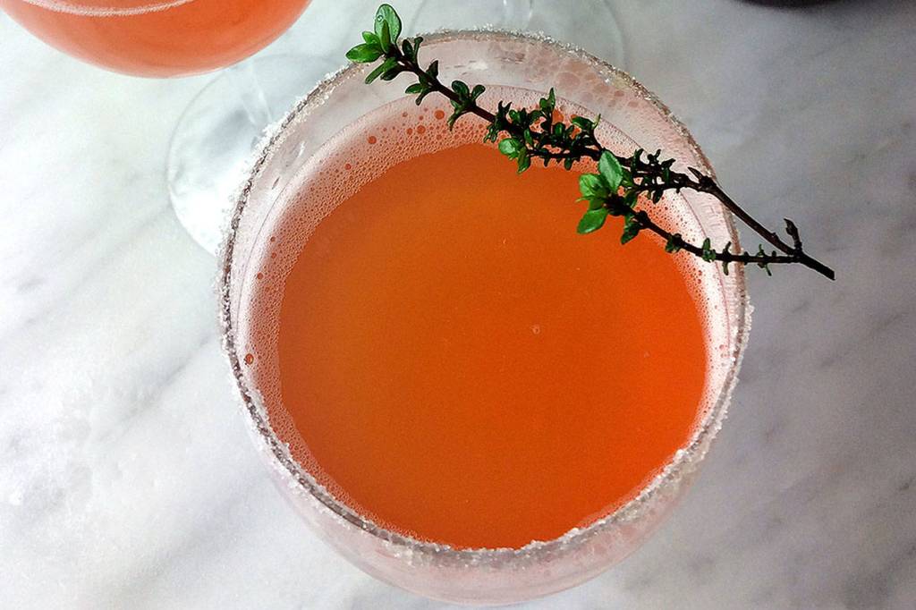 This is a colorful and very flavorful spin on the classic. You’ll be able to track down the blood orange Sanpellegrino in the high-fallutin’ section of the soft drink aisle. As you see in the photograph, although not essential, the sugar-coated rim and thyme sprig garnish really add to the experience.