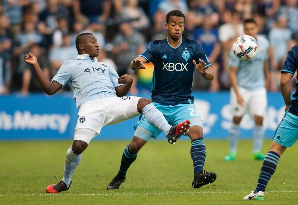 Sporting Kansas City defender Jimmy Medranda (94) kicks the ball away from Sounders midfielder Jordy Delem (21) during an MLS match on May 17, 2017, at Children’s Mercy Park in Kansas City, Kan. (Nick Tre. Smith/The Kansas City Star via AP)