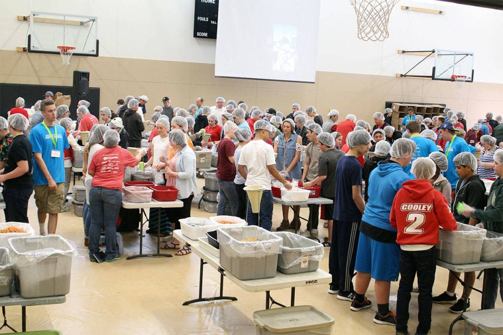Snohomish High School students on May 10 assembled more than 150,000 meals for a Fight Against Hunger event, organized through San Diego-based nonprofit Friends and Family Community Connection and Snohomish-based Dream Dinners’ Living the Dream Foundation.