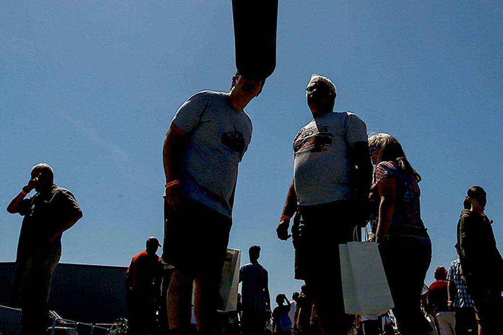 Attendants of Tankfest Northwest look through the barrel of a M2 155mm field gun on May 27 at the Flying Heritage and Combat Armor Museum in Everett. (Ian Terry / The Herald)