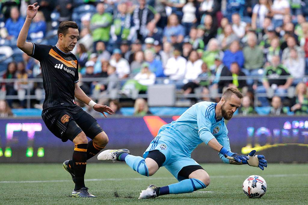 Ted S. Warren / Associated Press                                Seattle Sounders goalkeeper Stefan Frei dives on the ball as Houston Dynamo forward Erick Torres closes in during the first half of an MLS match Sunday in Seattle.