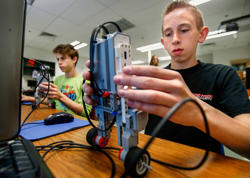 Granite Falls Middle School eighth-graders Howard Wilde (right foreground) and Jason Wad work at programming EV3 robots so they will balance in a vertical stance while moving about. (Dan Bates / The Herald)