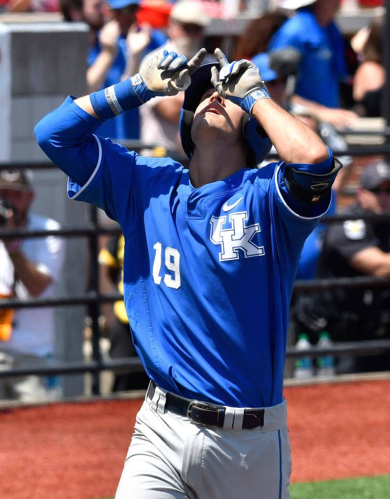 Kentucky’s Evan White points skyward as he crosses home plate after hitting a solo home run in the ninth inning during Friday in an NCAA Super Regional game against Louisville. (AP Photo / Timothy D. Easley)