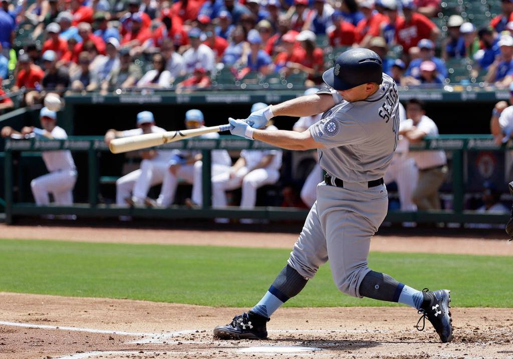 Seattle Mariners’ Kyle Seager follows through on a run-scoring double off a pitch from Texas Rangers’ Yu Darvish during the first inning of a baseball game, Sunday, June 18, 2017, in Arlington, Texas. (AP Photo/Tony Gutierrez)
