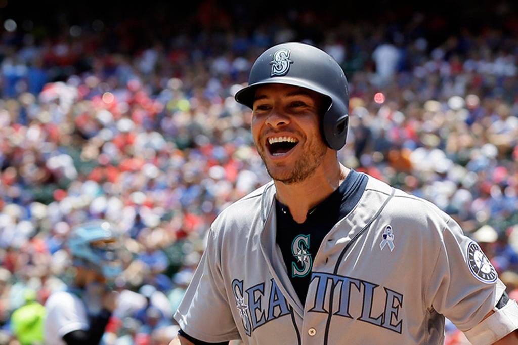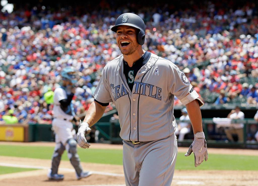 Seattle Mariners’ Danny Valencia smiles as he jogs to the dugout after hitting a two-run home run off a pitch from Texas Rangers’ Yu Darvish in the first inning of a baseball game, Sunday, June 18, 2017, in Arlington, Texas. (AP Photo/Tony Gutierrez)