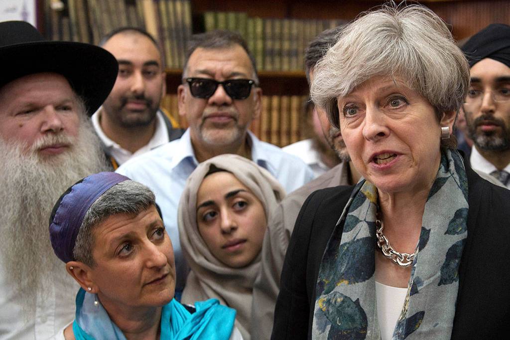 British Prime Minister Theresa May (right) talks to faith leaders at Finsbury Park Mosque in north London after a van struck pedestrians Monday. (Stefan Rousseau/Pool Photo via AP)