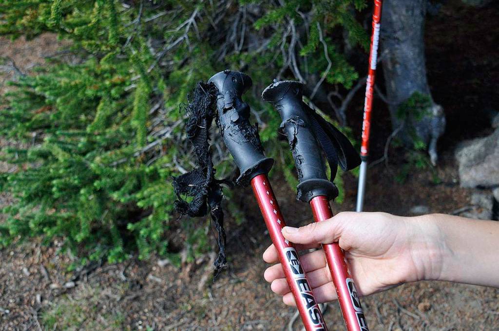 Consider hanging trekking poles out of reach of animals when camping overnight to prevent deer and rodents, including porcupines, from gnawing on the handles for the sweat salt.
