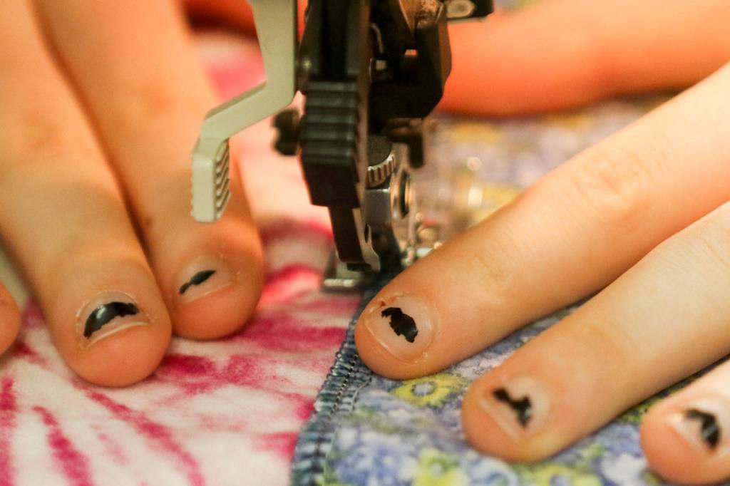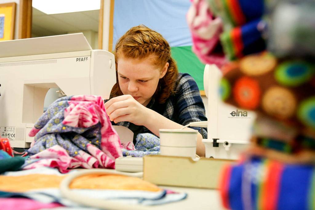 Doyle’s granddaughter, Elissa Koozer, 15, came to help sew last Saturday. The high school sophomore said she’d heard a lot about the program from her grandma, but it was special to be part of it. She looked down at purple and blue flowered fabric she was feeding through her sewing machine.