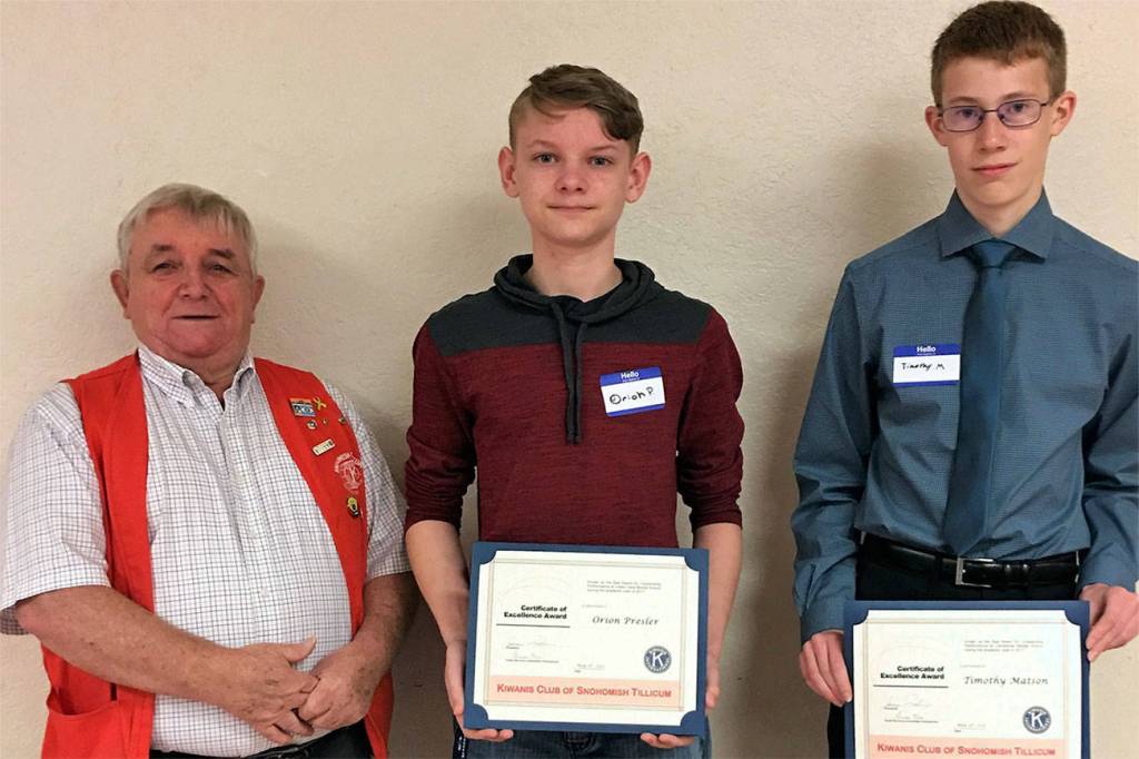 The Snohomish Tillicum Kiwanis presented its annual Dux Awards to eighth-graders Orion Presler (Valley View Middle School) and Timothy Matson (Centennial Middle School).