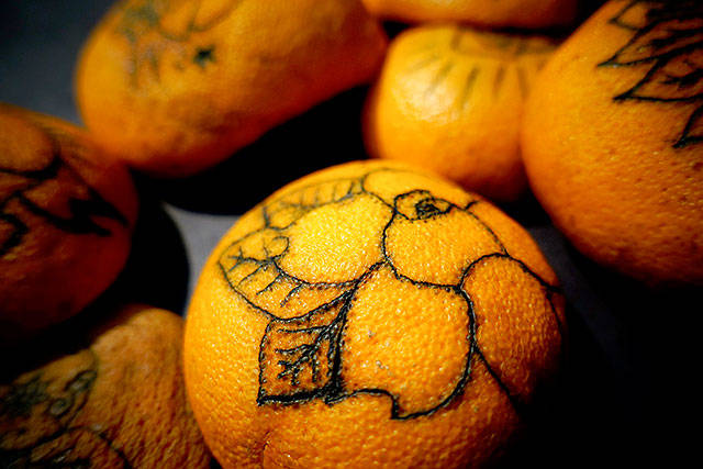 The exhibit also includes flora and fauna prints in metal displayed in shadow boxes made from charred wood. Be sure to see the halved glass ammonite shells embedded in glass bricks, along with the tattooed orange peels.