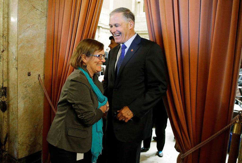 Washington Gov. Jay Inslee (right) greets Rep. June Robinson, D-Everett, in the wings of the House chamber at the Capitol in Olympia after the Legislature approved a new two-year state operating budget. (AP Photo/Ted S. Warren)