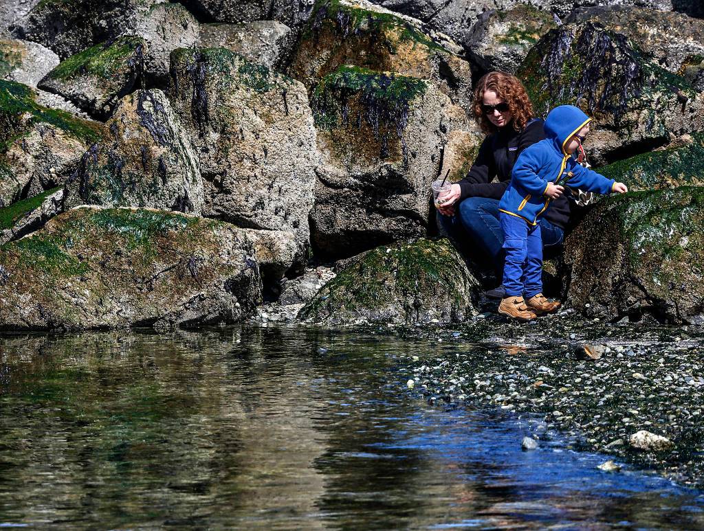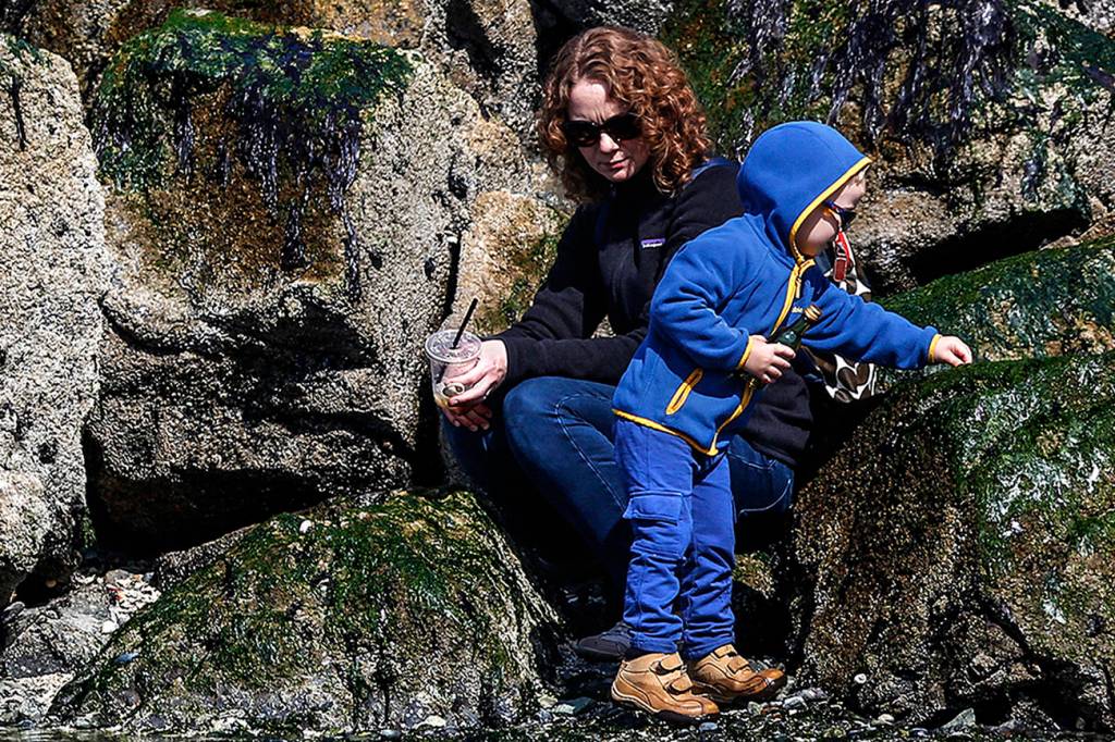 Susan Hanson and her 3-year-old son, Raymond Fulmer, explore big rocks in the jetty tidal area of Brackett’s Landing. (Dan Bates / The Herald)