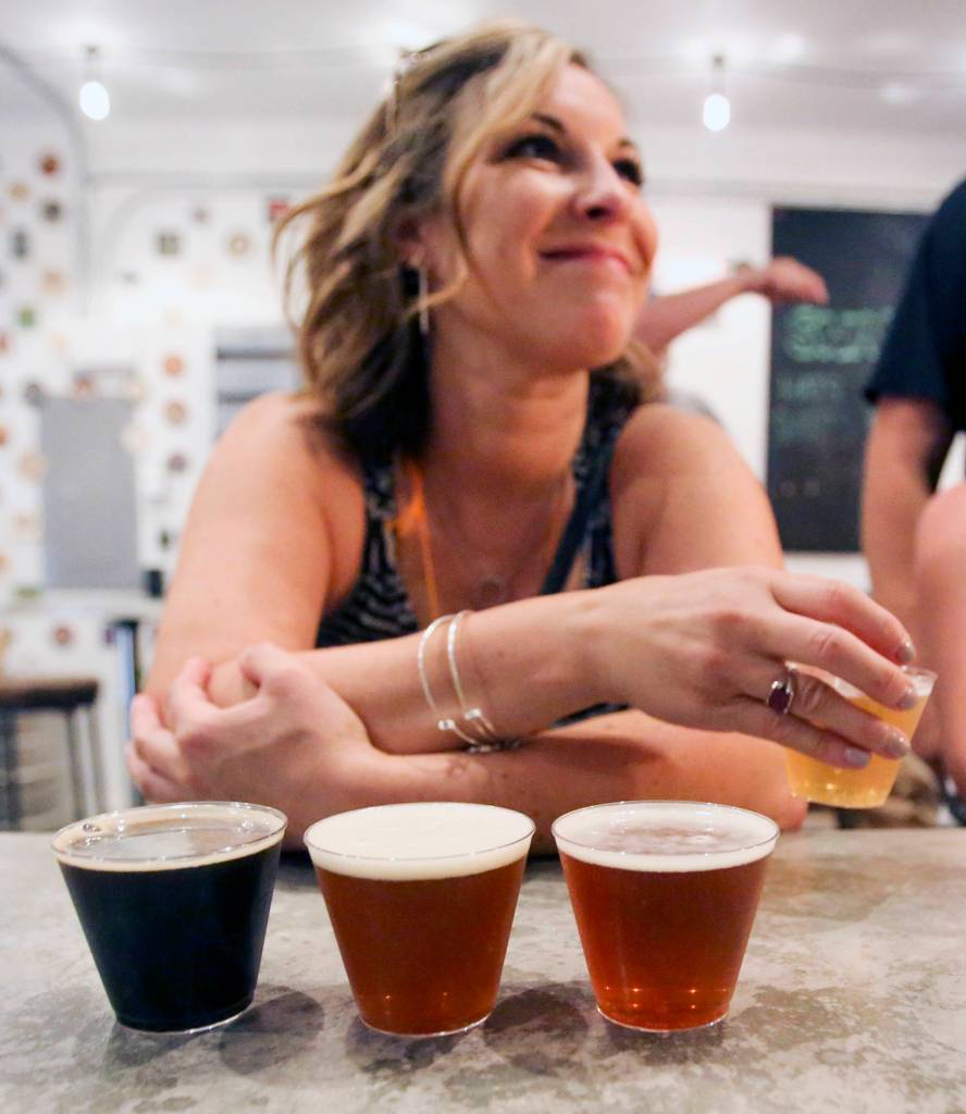 Megan Eison is ready to enjoy her four sample microbrews at Scrappy Punk Brewery during the inaugural Soho Brew Tour in Snohomish on June 24. (Kevin Clark / The Herald)